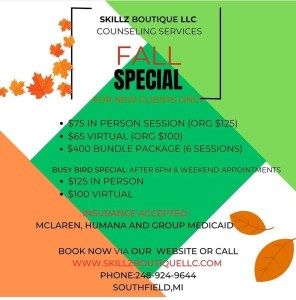 Therapy is for everyone. Whatever brought you here to explore counseling for yourself, this is a step to finding more joy & peace in your life. Skillz Boutique rest on the philosophy of handpicking interventions and methods that fit your comfort and needs. Embark on a journey of mental health & wellness today!